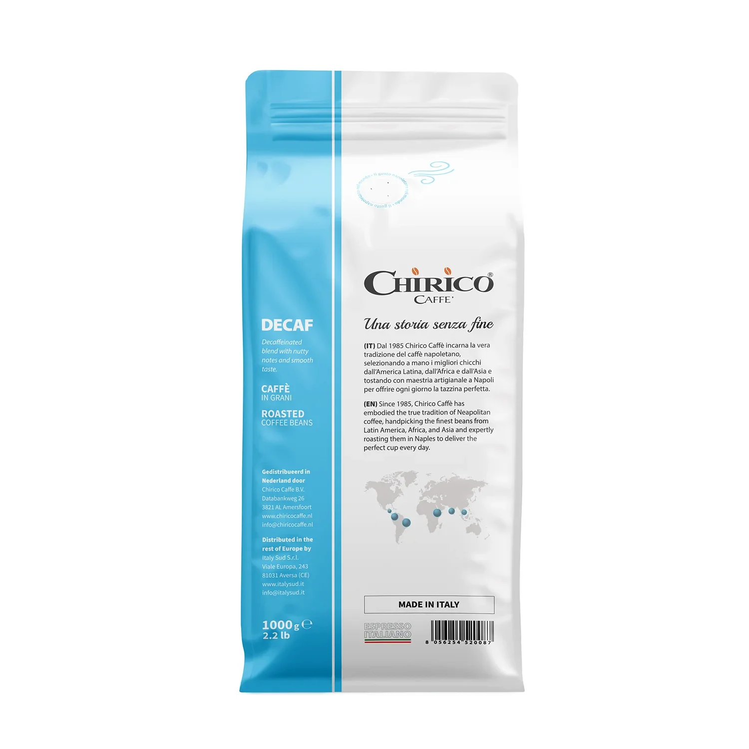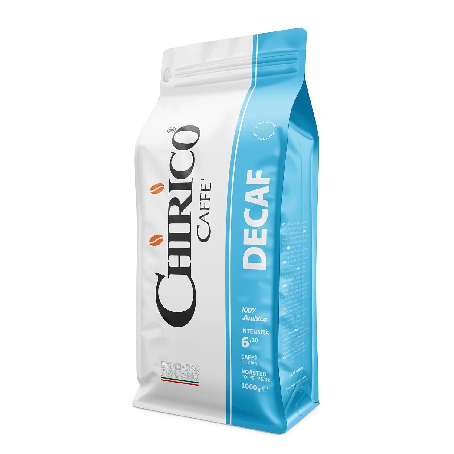 Chirico Caffè Decaffeinato 100% Arabica biedt dezelfde verfijnde smaakbeleving als een volle koffie, maar dan zonder cafeïne. Met zorg gebrand in Zuid-Italië, blijft de rijke aroma’s en zachte complexiteit van pure Arabica behouden, zodat je op elk moment van de dag kunt genieten – ook ’s avonds.