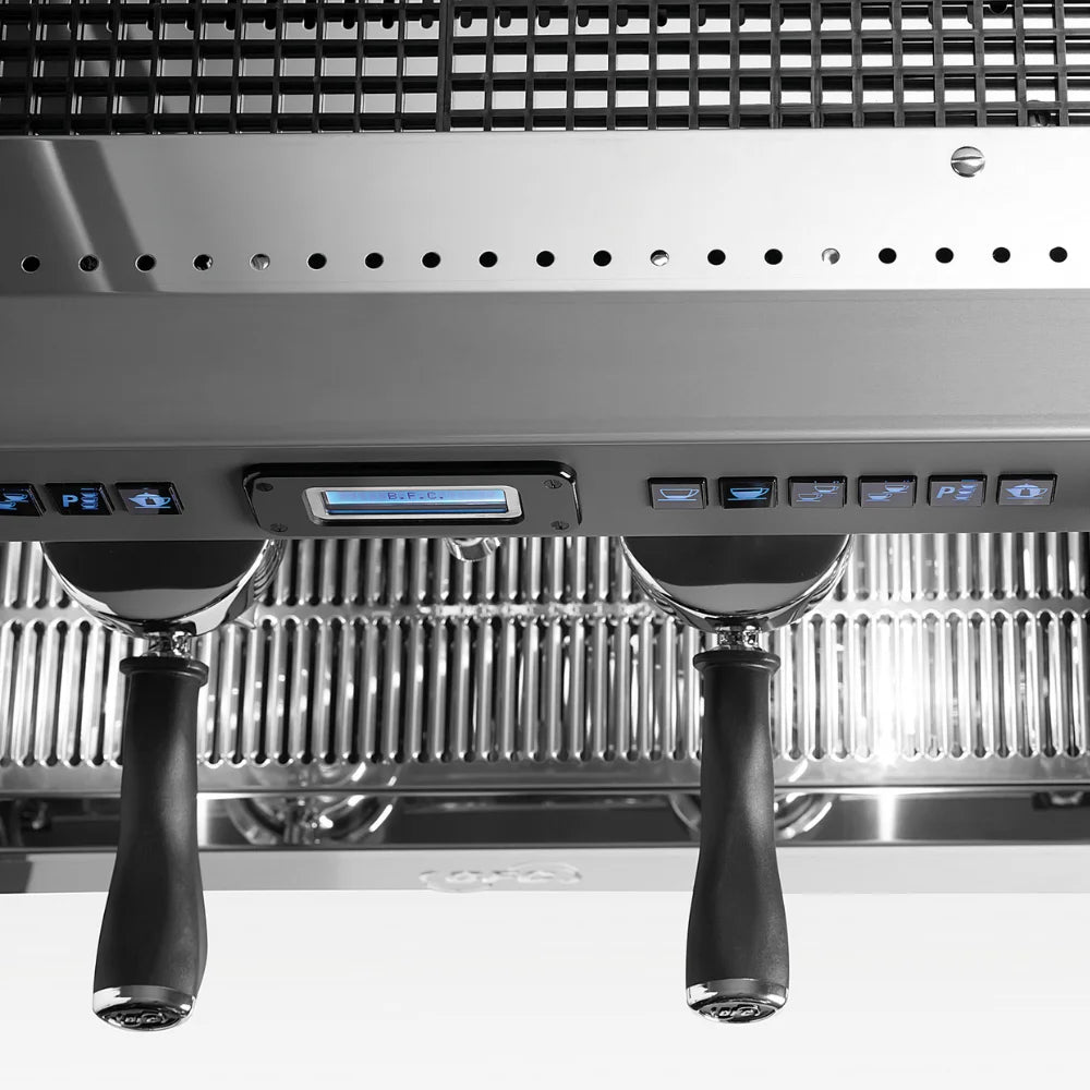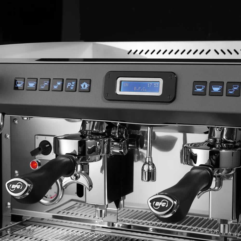 De BFC De Lux RS is een professionele espressomachine met vaste wateraansluiting, verkrijgbaar in 2-groepsuitvoering. Uitgerust met een LCD-display voor het instellen van parameters zoals tijd, dosis en service-informatie, en voorzien van koperen boilers met thermosifoncirculatie voor uitstekende warmteverdeling. De T.C.I.-technologie (optioneel) biedt onafhankelijke temperatuurregeling per zetgroep, terwijl thermo gebalanceerde groepen met pre-infusie zorgen voor optimale extractie. Verkrijgbaar in diverse kleuren en geschikt voor intensief gebruik in de horeca.